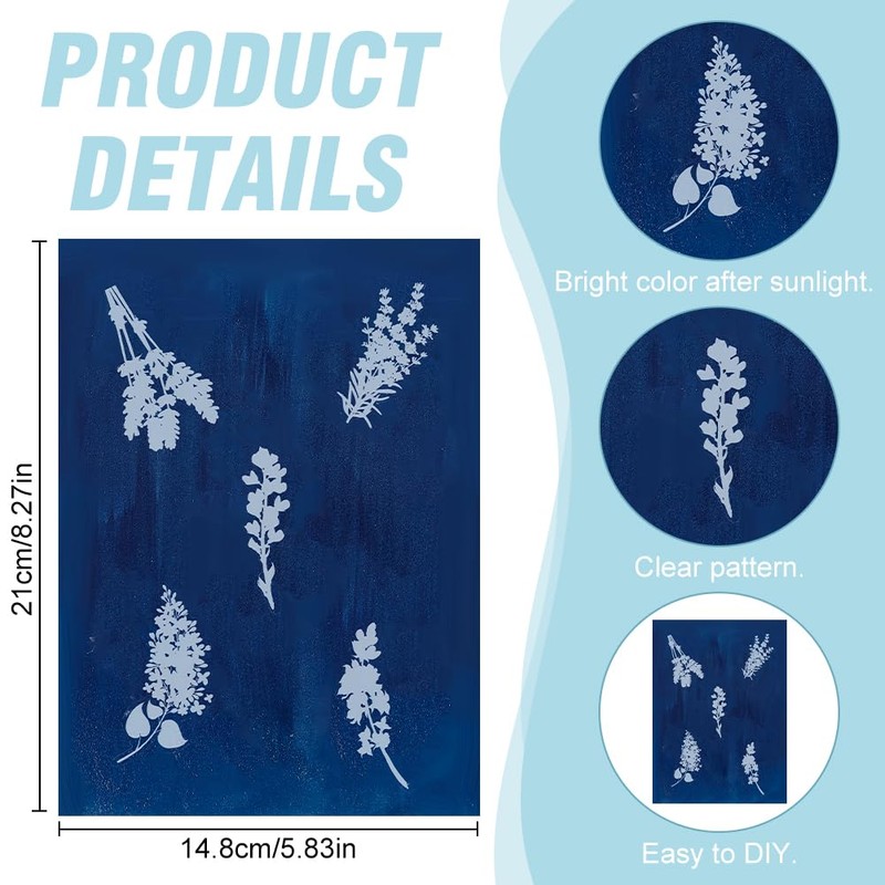 • Easy to Use:Simply place the items you want to make on the sun print paper and clamp them with the adhesive sleeve in the package.Wait for the sun to dry it out before rinsing it with water, and when it's dry, the artwork is complete