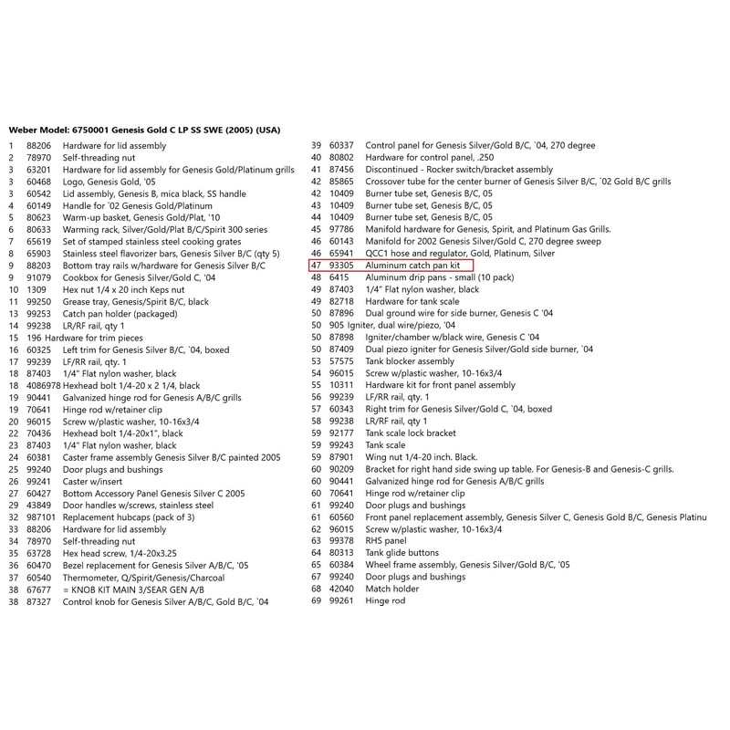 - Kit includes 1 Weber aluminum grease catch pan and 1 Weber disposable foil liner.