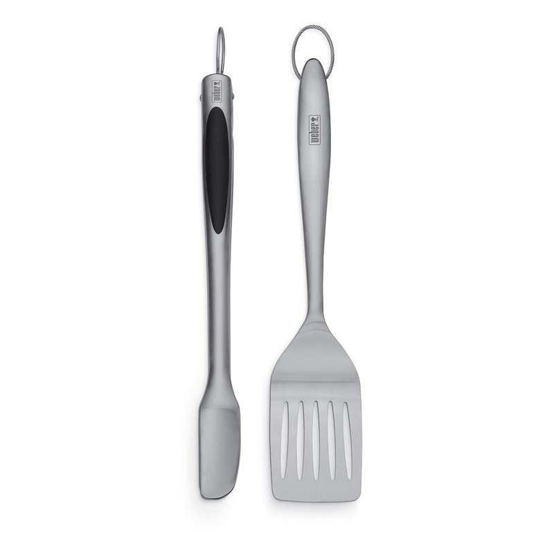 Weber style accessories offer the perfect mix of appearance, durability & function. Includes spatula & tongs. Ergonomic designs & soft-touch grips provide excellent control. Hands-free locking tongs.