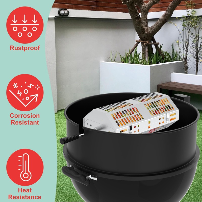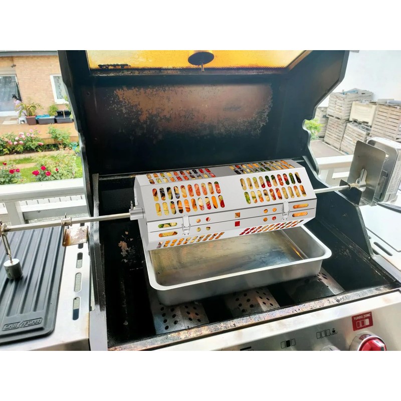 - LOCKING DESIGN: When the food is cooking, our locking clasp can firmly lock the food to prevent it from falling during the rotation process, and unlocking the clasp can be used to take out or put in the food, flexible to use according to the cooking needs. Two compartments to better hold your food, not easy to fall out during spinning. Our upgraded rotisserie grill basket seal is also top notch, ensuring that your food is fully smoked and roasted, leaving your meat juicy and tender.
