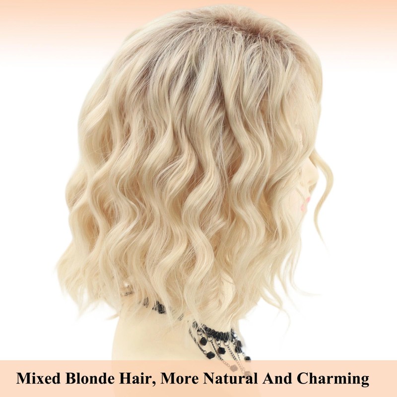 Webshaiy Platinum Blonde Wigs for Women, Short Curly Wavy Layered Bob Wig with Side Bangs, Ready To Go Natural Synthetic Glueless Wig Fringe with Dark Roots