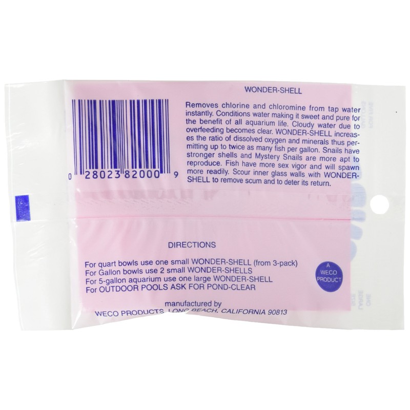 Decorative, molded scallop-shaped shells, Weco Wonder Shell is made of all natural ingredients that provide beneficial minerals and electrolytes to aquarium water. Each shell oxygenates, aerates and neutralizes harmful acids. Provides crabs, snails and turtles with an easily available source of calcium for healthy shell growth.