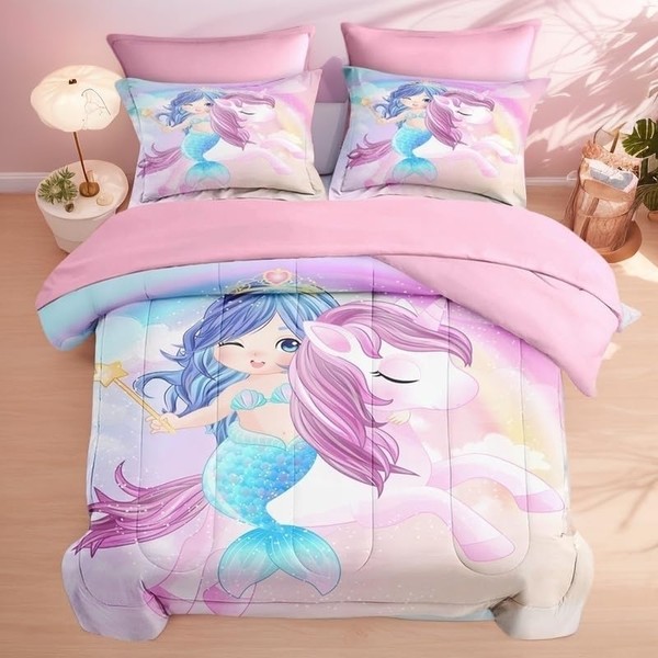 WeCozy Twin Size Comforter Set with Pillowcase & Sham, Cute Unicorn Mermaid 5 Pcs Bedding for Kids and Teens, Love Kids Rainbow Bed in a Bag with Flat Fitted Sheet