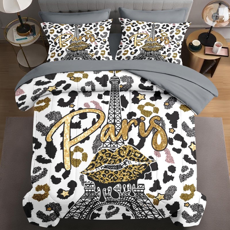 WeCozy Twin Size Comforter Set with Pillowcase & Sham, Paris Black Gold Tower 5 Pcs Bedding for Kids and Adults, French Golden Leopard Bed in a Bag with Flat Fitted Sheet