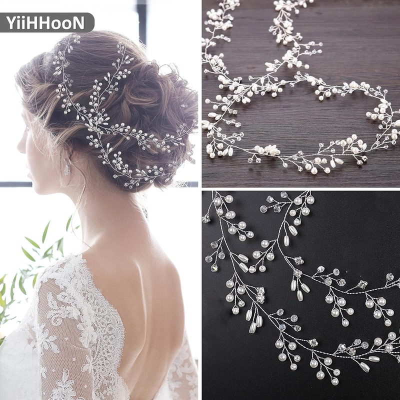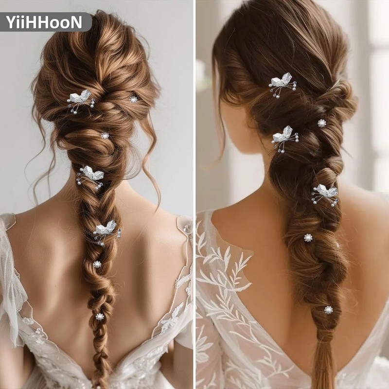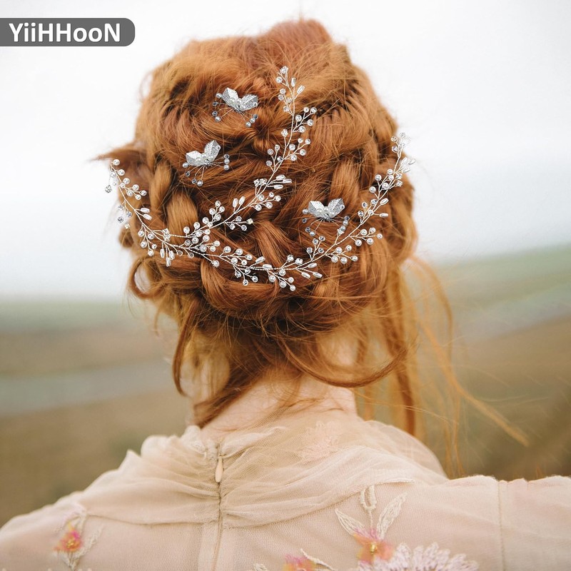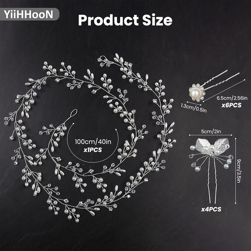 Includes 11 pieces: a 100cm wedding hair vine and 10 silver hairpins in two styles. Made of alloy, faux pearls, and crystals for a smooth, shiny, and durable finish. Adjustable design with delicate leaves, pearls, and rhinestones. Perfect for weddings, parties, photography, and gifts.