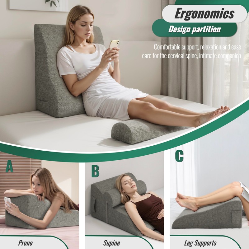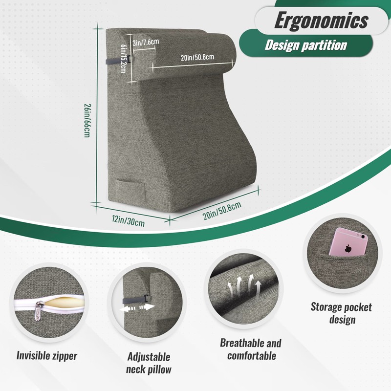 Wedge Support Pillow - Adjustable Pillows for After Surgery Orthopedic Bed Wedge Pillow for Head, Neck, Back, Shoulders Support - Ergonomic Pillows for Sleeping Linen Grayish Black 19*12*25 Inches
