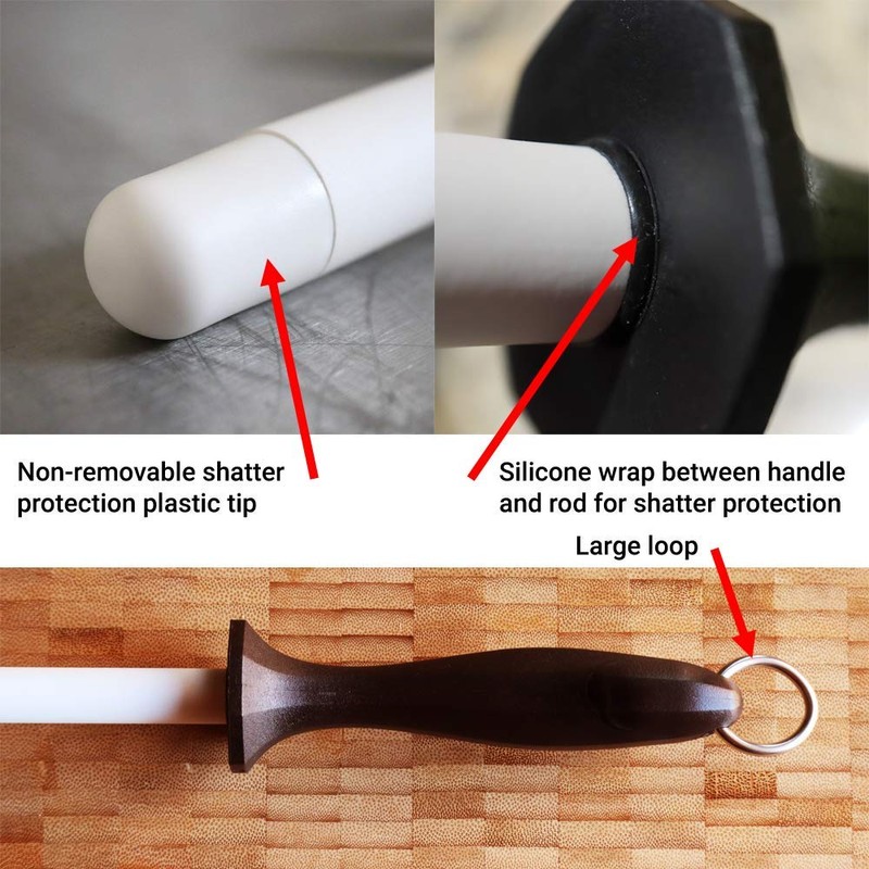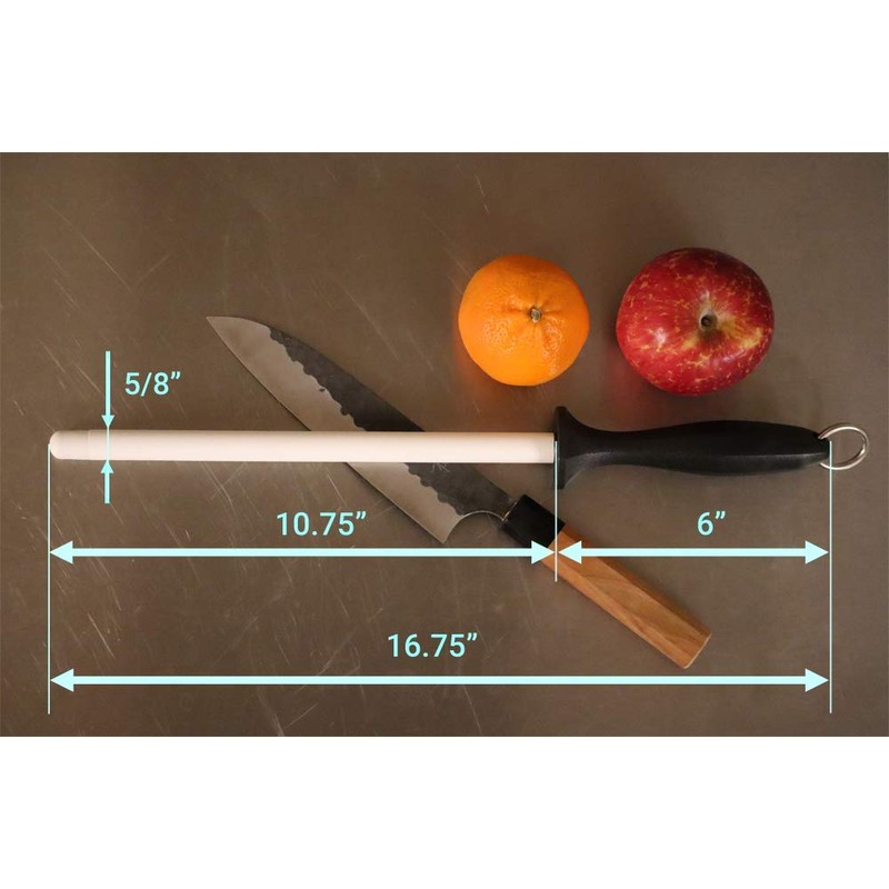 • Ceramic rod length: 10.75". Handle length: 6" (larger than any other rod). Large metal hanging loop. Guides material: plastic.