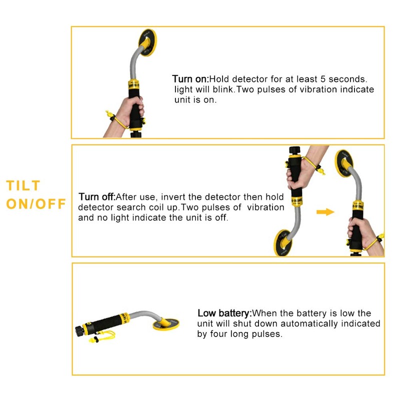 **Tilt On and Off:** No push button switches. The pin pointer turns on and off when pointed upward or will automatically turn itself off one minute after the last detection