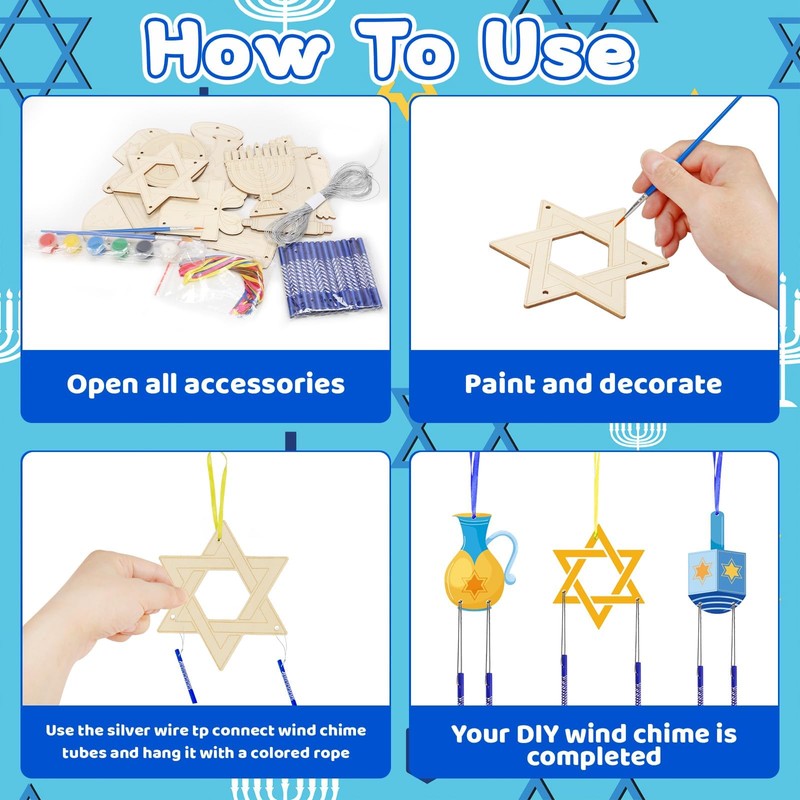 - Complete craft set: the Hanukkah craft set children contains 12 Hanukkah wind chimes, paints, brushes and other accessories. The Hanukkah craft set offers children the opportunity to create unique Hanukkah craftsmanship and improve their craft skills.