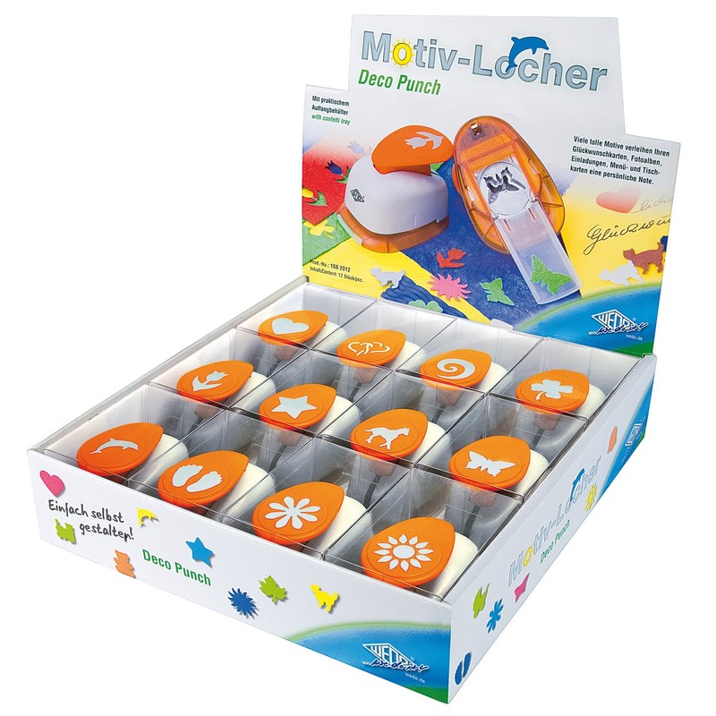 WEDO 168 248 Deco Fish shape punch for handicrafts and creative working. Easy to use with built in waste collection box. Punches through all standard coloured papers up to 220 gsm. Size: 7.5 x 5.2 x 4.8 cm.
