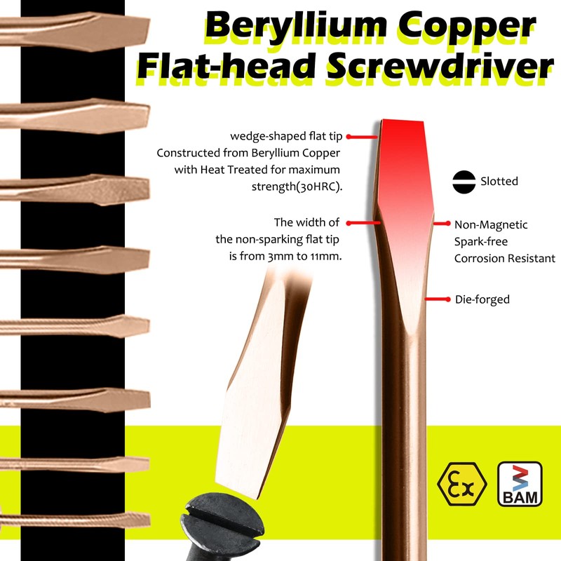 - đ§°ăNON-SPARKINGăConstructed from Beryllium Copper with Heat Treated for maximum strength(40HRC). Appropriate for operation with hydrogen concentration below 21%. For use where flammable or combustible vapors, liquids, dust or residue are present, Designed to eliminate the risk of sparks at sites where explosive atmospheres (flammable or combustible vapors, liquids, dusts) may be present