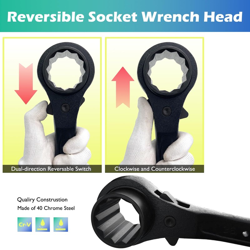 USES: One Side Ratchet Socket Wrench is used to fastening and removing bolts and nuts; Comfortable grip, safe use, corrosion resistant and durable.It is forbidden to use as a hammer or use with lever arm, also forbidden to tread or strike.