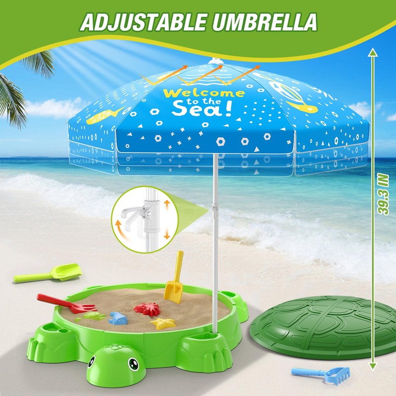 Wee Wonders Turtle Sandbox with Lid & Adjustable Umbrella, Sand Box with Cover incl 8 Beach Toys, Kids Sand Activity Suit for Sensory Playsand, Summer Indoor Outdoor Toys Gifts for Toddler 3-5
