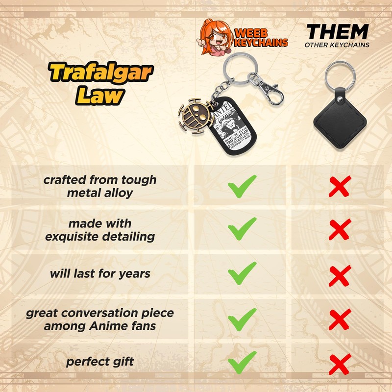 - An Accessory Fit for a Pirate Doctor: This One Piece anime keychain, featuring the cunning Trafalgar Law, is the perfect addition to any Law cosplay outfit. The metal dog tag showcases the wanted poster of the legendary pirate, adding a touch of adventure to your everyday look. The durable construction and stylish design of these anime keychains make them a must-have accessory for fans who want to show their love for the series and the pirate doctor.