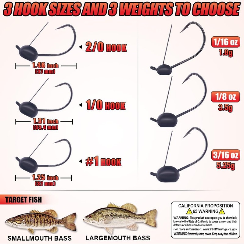 - 10-Pack for Versatile Bass Fishing--Available in 1/16 oz (1.8g), 1/8 oz (3.5g), and 3/16 oz (5.25g) sizes Includes 10 premium-quality hooks, making it a valuable addition to any tackle box. Ideal for anglers targeting bass in lakes, rivers, reservoirs, and heavy vegetation environments.