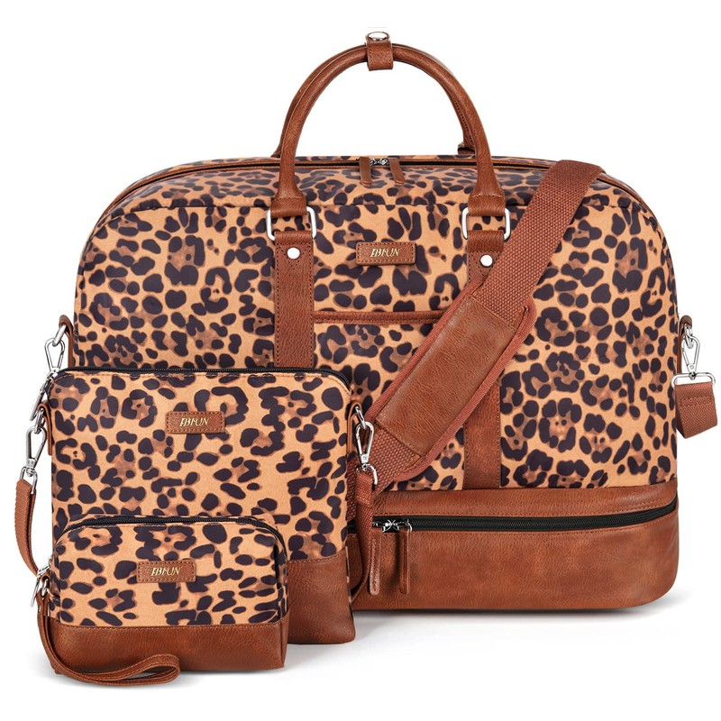 - 3pcs set weekender bag: made of sturdy Oxford cloth and faux leather material, lining is made of polyester. The 3pcs set weekend overnight bag design (travel duffel + crossbody bag + cosmetic bag);.
