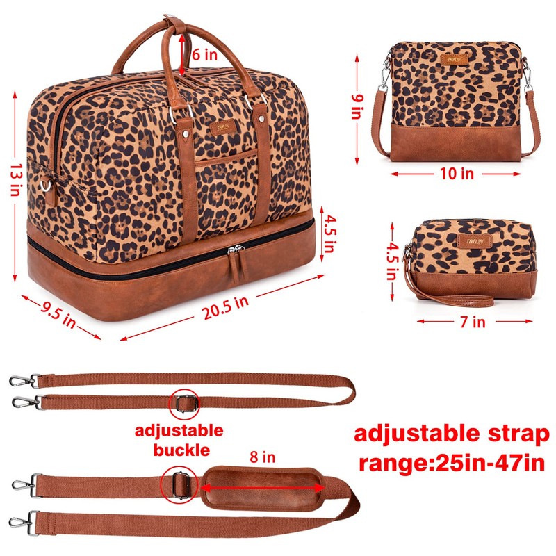- Dimensions: large weekender overnight bag: 20.5"L×9.5"W×13"H, (spacious to pack 2-4 days worth of daily essentials such as clothes, toiletries and electronics, can hold up to 17 inch laptop) crossbody bag: 10"L×9"H, toiletry Bag: 7"L×4.5"H. Two adjustable straps(thin+wide) range: 25"-47". Cushioning design of wide strap can reduce stress and relieve fatigue makes travel easier.