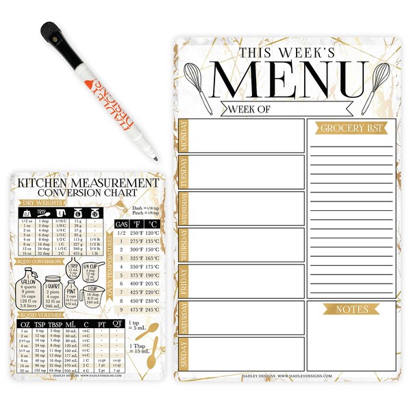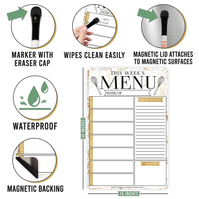 - Master Your Menu, Meet Your Goals; The white and gold marble design meal planning magnet for fridge makes it easy to put healthy food on the table; Easily erasable meal planner dry erase board is a menu board for restaurant or dry erase meal planner for fridge