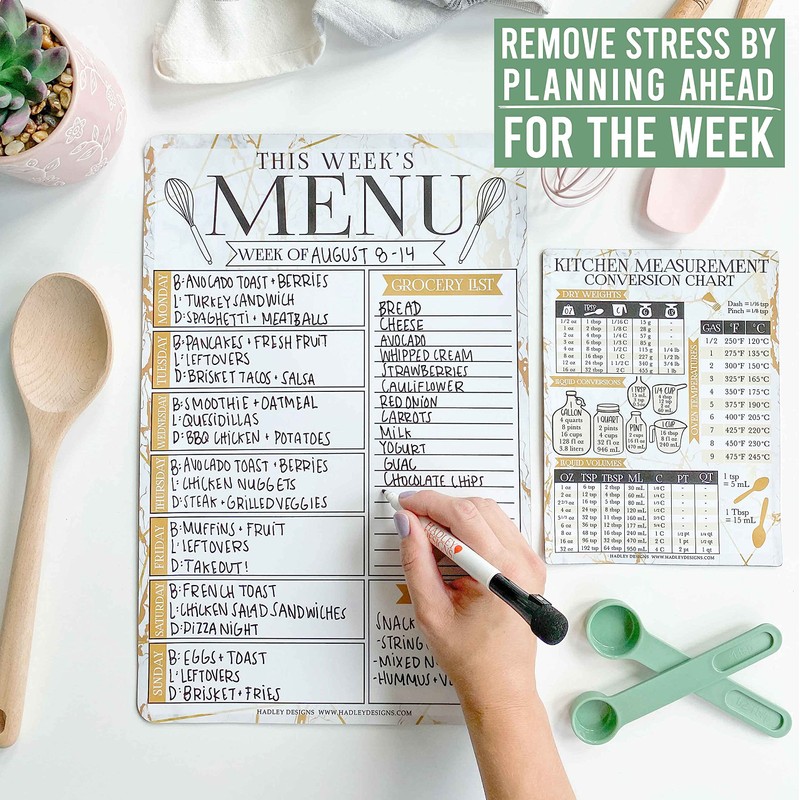 - Master Mealtime; you'll receive 1 10x15 magnetic meal planner for refrigerator dry erase, 1 6x8 kitchen measurement conversion chart, and 1 dry erase marker; The weekly meal planner magnetic makes it easy to schedule meals for the family