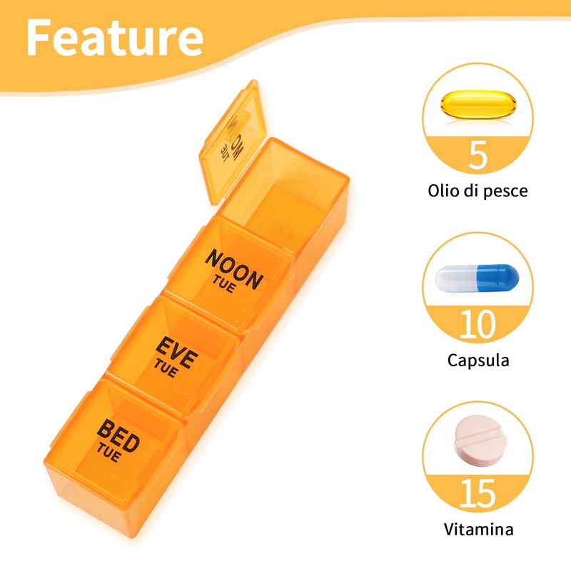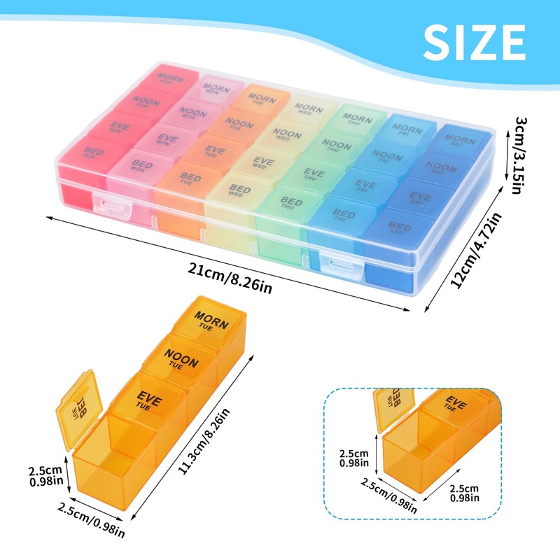 Product Description:Our Weekly Pill Box is the perfect accessory for anyone who needs to regularly take vitamins, supplements or medicines. With 28 daily compartments, this 7-day pill dispenser gives you an easy and convenient way to organize your medication throughout the week. The compact and portable design makes this weekly pill holder easy to carry wherever you go, while the secure closure gives you peace of mind that your medication is safe. With our weekly pill box, you will no longer have to worry about forgetting to take your pills.