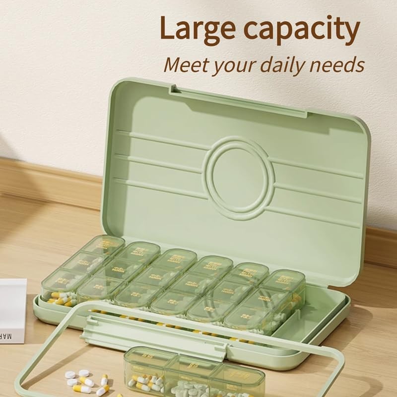 - [ Large Pill Organizer] It has 21 or 28 cells, which can store many small tablets in each internal compartment. The daily pill organizer is made of food grade plastic, safe for medical use.