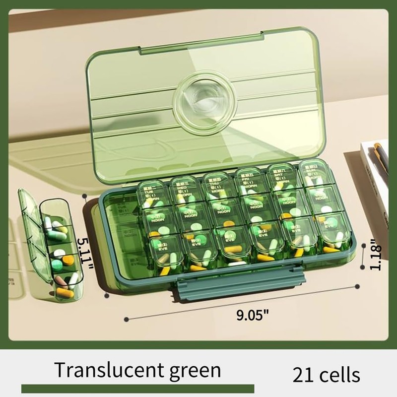 Weekly Pill Organizer 3 Times A Day, Large Capacity Pill Case with 21 Cells, Push Button 7 Day Pill Box for Vitamin/Cod Liver Oil/Supplements (Translucent Green,21 Cells)