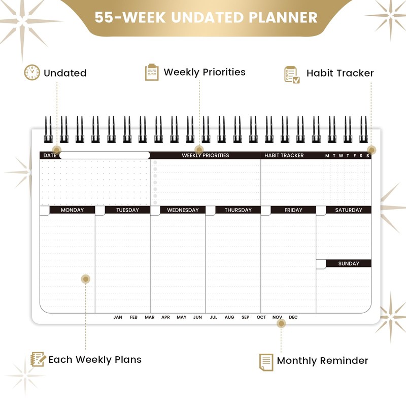 Weekly Planner - Undated Planner for Whole Year, Weekly To Do List, Planner Daily Weekly and Monthly, Goals Scheduled Planner with Habit Tracker, 55 Weeks, 6.3''x11.2''