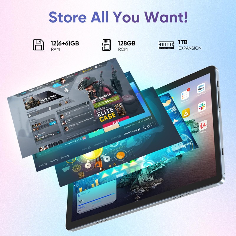 - 【14GB (6GB + 8GB Expansion) RAM + 128GB ROM + 1TB Expandable Storage】 The 10.1-inch Android tablet boasts a robust storage combination of 14GB RAM (6GB physical + 8GB virtual, enabled through expansion technology) and 128GB ROM. This provides ample space to store your digital life, including HD videos, lossless music, extensive eBooks, and various online course materials. Additionally, storage can be expanded by up to 1TB using a microSD/TF card (sold separately).