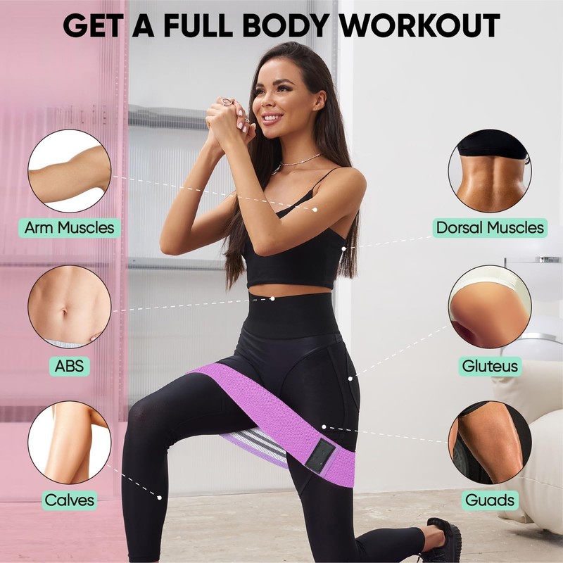 - 3 Resistance Levels:This set includes 3 fabric resistance bands in green (15-25 lbs),pink (25-35 lbs) and purple (35-45 lbs).Whether you're a beginner or an advanced fitness enthusiast, these bands offer the perfect resistance for glute activation,leg workouts,and full-body training.The 8cm width ensures maximum comfort and stability during intense workouts.