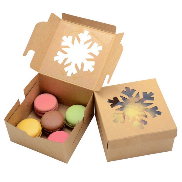 • UNIQUE SNOWFAKE WINDOW DESIGN:The small pastry box with the built-in shop window! Show off your treats!! The crystal clear window lets your customers see the delicious products clearly. They will appreciate your skill. The edges of the window adopt an attractive snowfake design.Perfect kraft paper boxes for Christmas holidays party favors.