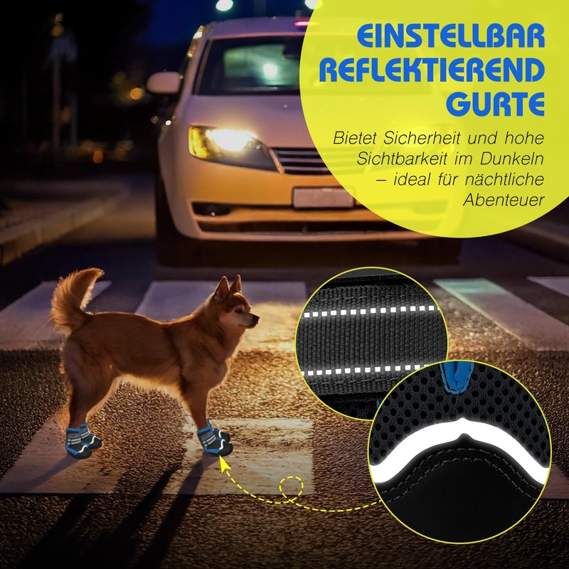 With practical, double adjustable straps, the shoes can be easily adjusted and perfectly adjusted. The reflective straps guarantee safety, especially at dusk or during night walks. At the same time, the robust, non-slip rubber soles protect against sharp objects and hot asphalt, so your dog can play outdoors without hesitation.
