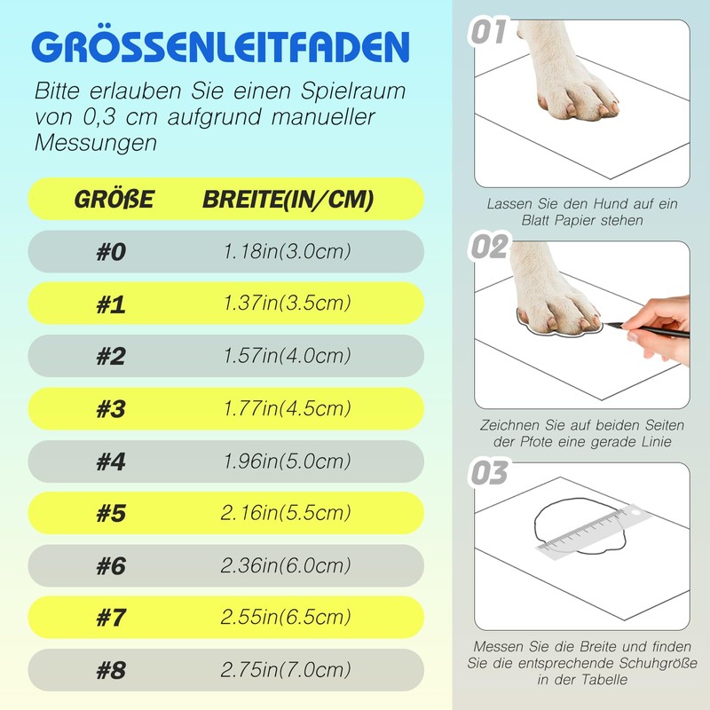 - Versatile size options for every dog - Our dog shoes are available in 9 sizes (0-8), so you can find the right fit for your dog. Measure the width of the paws carefully and use our size chart to choose the ideal paw protection for your dog and provide them with optimal comfort.