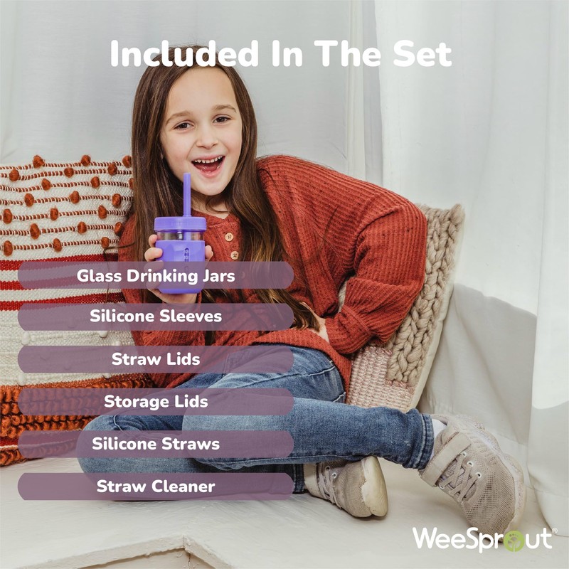 WeeSprout Glass Cups With Lids & Straws, Spill-Resistant Smoothie Jars for Toddlers & Kids, Baby Food Storage & Snack Containers, XL Silicone Straw, Easy-grip Sleeves, Set of Four, Dishwasher Safe
