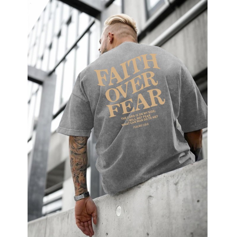 Weetiotio Christian Faith Over Fear Shirt for Men Jesus Religious Shirts Oversized Graphic Tees Acid Wash God T-Shirt(Light Gray,XL(Gold)
