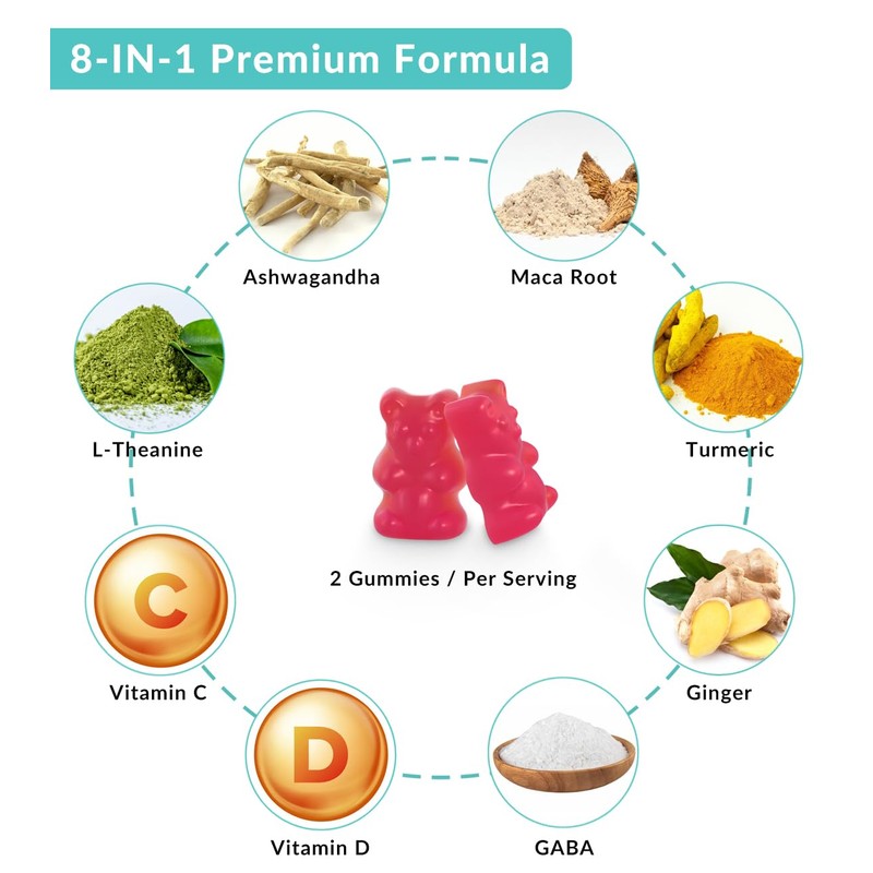 - Premium Formula: Per serving ashwagandha gummies contain organic ashwa root powder, combined with maca root powder, turmeric, ginger, L-Theanine, GABA, vitamin C, vitamin D for maximal efficacy. Comes with 120 ashwa gummies, 2 month supply.