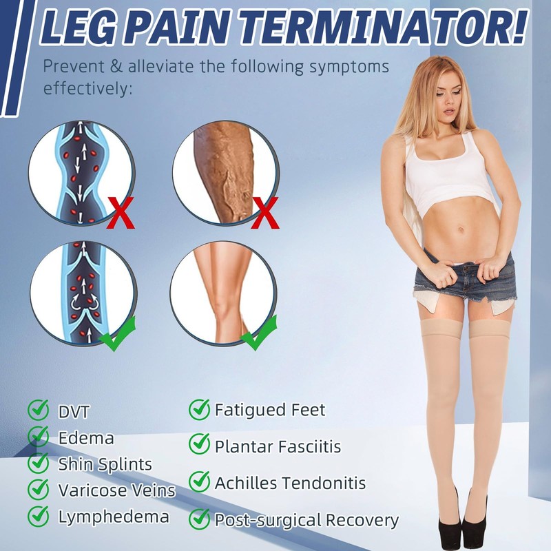 - 🏆PREMIUM & BREATHABLE MATERIAL: This 20-30 mmHg thigh high compression stockings is crafted from high-quality raw materials -spandex and nylon, long-lasting, breathable, and moisture-wicking. And elastic bands and silicone dots fit your legs perfectly without slipping. These compression socks ensure your feet stay dry, odor-free, and comfortable all day long.