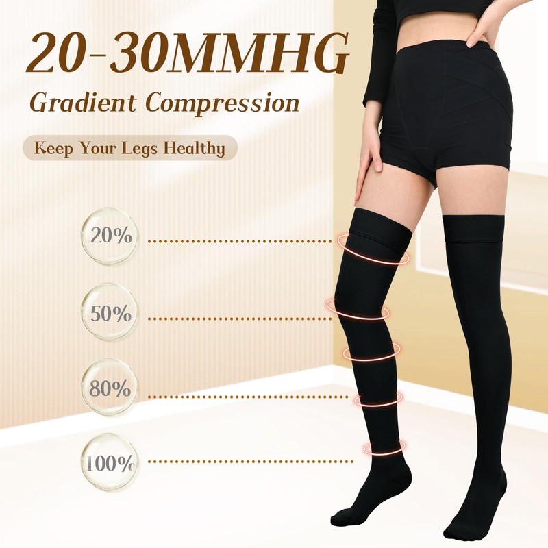 - ALL-DAY COMFORT--The compression Stockings are made from a durable nylon and spandex blend for consistent elasticity and compression. Silicone band for wearing comfort yet snugly fit to ensure the compression stockings remain in place without constricting your leg.