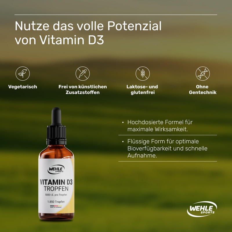 Wehle Sports Vitamin D3 Laborgeprüfte 5000 IE pro Tropfen hochdosiert Vergleichs-Sieger 2019-2021 - Hoch bioverfügbares Vitamin D flüssig 50ml (1850 Tropfen) mit MCT-Öl aus Kokos