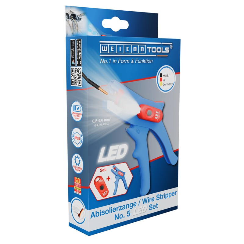 - SET – Die Kombination aus WEICON TOOLS Abisolierzange No. 5 und LED-Licht sorgt für präzises Arbeiten in dunklen Umgebungen, wie Werkstätten, Baustellen & engen Schaltschränken.
