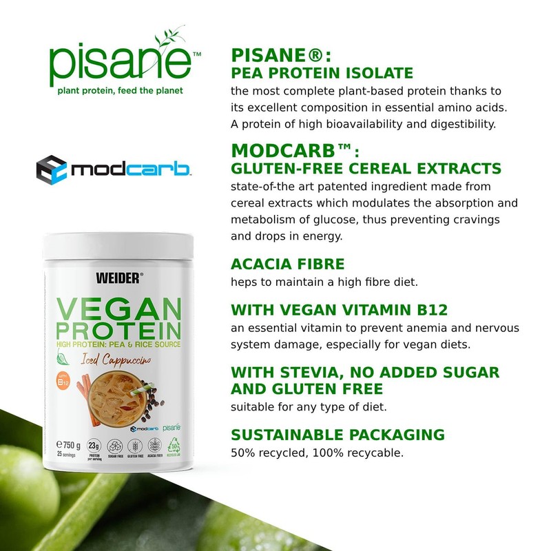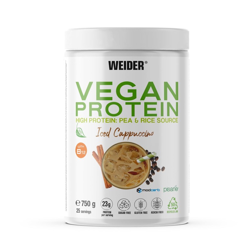 Weider Weider Vegan Protein (750g) Iced Cappuccino Flavour. 23g Protein/dose, Pea Isolate (Pisane) & Rice Protein. with Vitamin B12 & Stevia. Gluten Free, Sugar Free. Packaging 50% Recycled 100% Recyclable