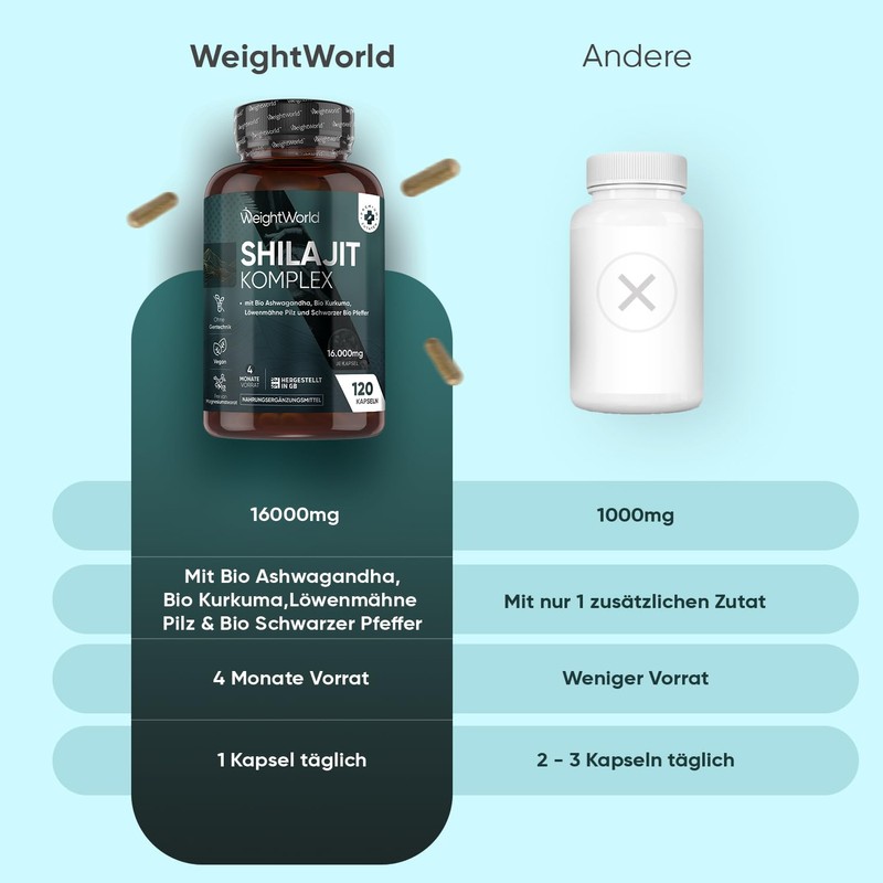 WeightWorld Shilajit Komplex 16.000mg - 120 vegane Kapseln fr 4 Monate Vorrat - Mit Bio Ashwagandha, Bio Kurkuma, L?wenm?hne Pilz & Schwarzer Pfeffer - Shilajit Extrakt (40:1) von WeightWorld