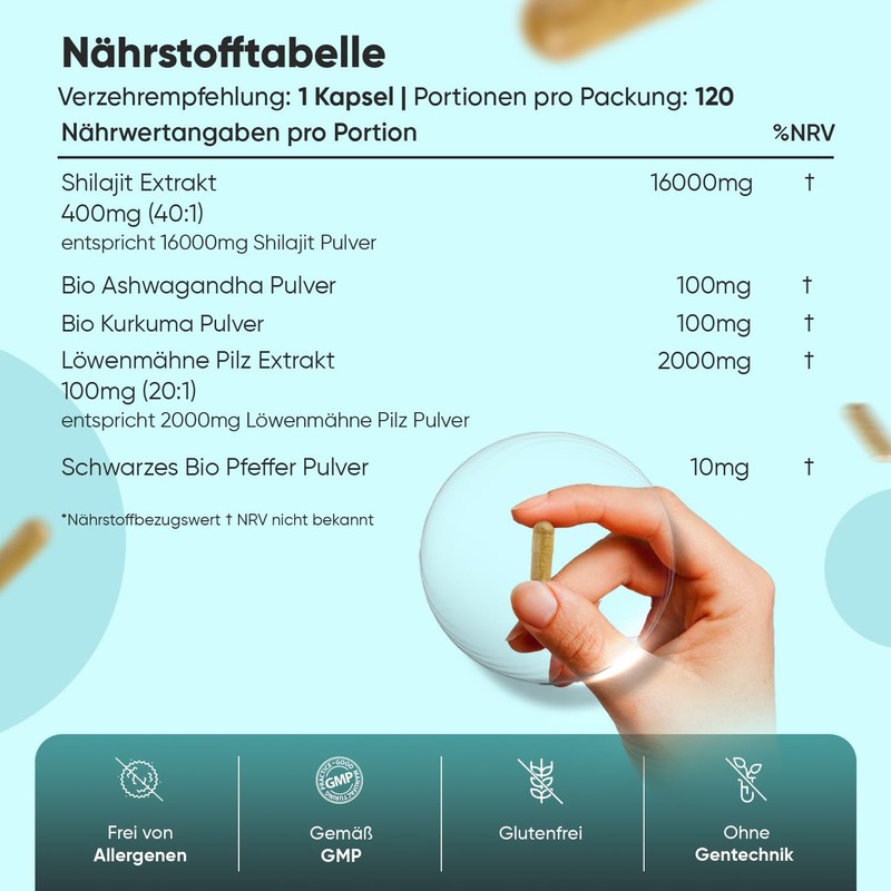 - Shilajit Komplex - Dieses Produkt enth?lt Bio Ashwagandha, Bio Kurkuma, L?wenm?hne Pilz Extrakt und Schwarzen Bio Pfeffer. Es enth?lt 16000 mg pro Portion mit 120 Kapseln fr eine 4 monatige Vorrat.