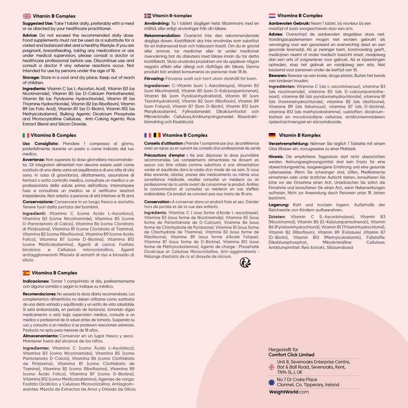 WeightWorld Vitamin B Komplex mit Vitamin C - 365 Tabletten - Alle 8 B-Vitamine (B1, B2, B3, B5, B6, B7, B9, B12) - 1 Jahr Vorrat & Vegan - WeightWorld