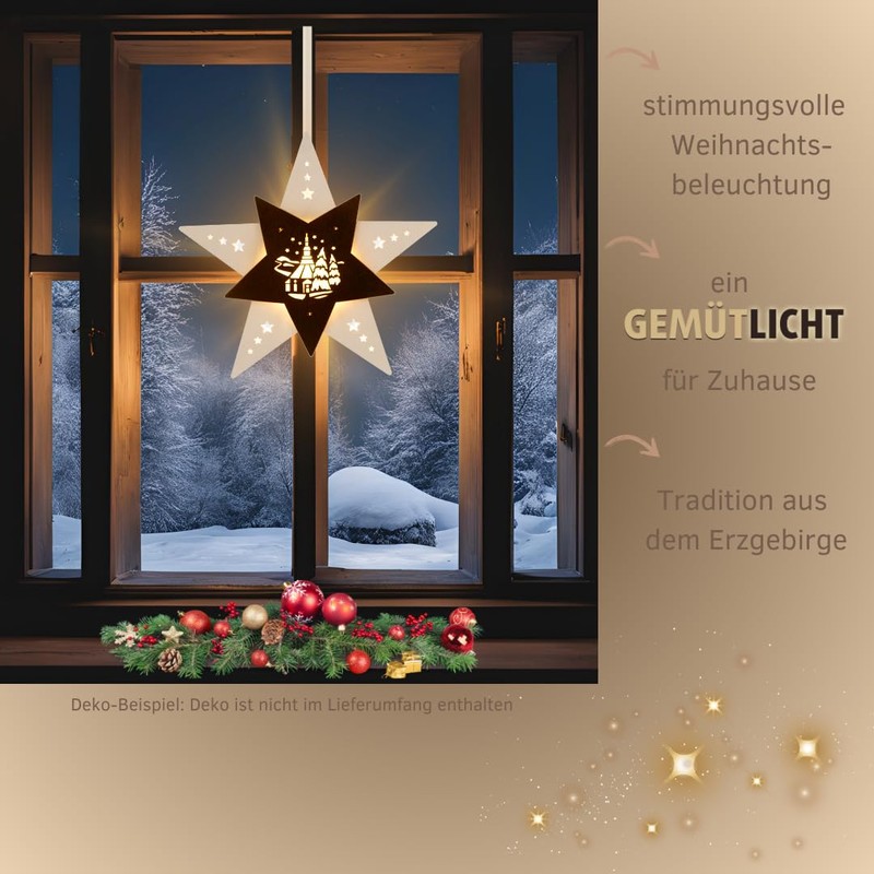 weigla - Fensterbild original Erzgebirge Stern Seiffener Kirche I Weihnachtsdeko Fenster I 1 LED Lampe I 0,8 W, E14 I Fensterbild Weihnachten I Weihnachtsbeleuchtung Holz I Fensterdeko hängend