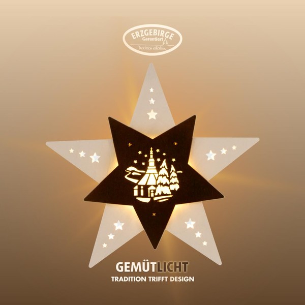 'The sticker Star "Seiffener Church is a real eye catcher for the young and the young at heart. It is made from FSC -certified/plywood. The NFC of the Star is in white, the front panel with the Seiffen church is available in brown colour. A special with these sticker is the energy saving LED lighting.