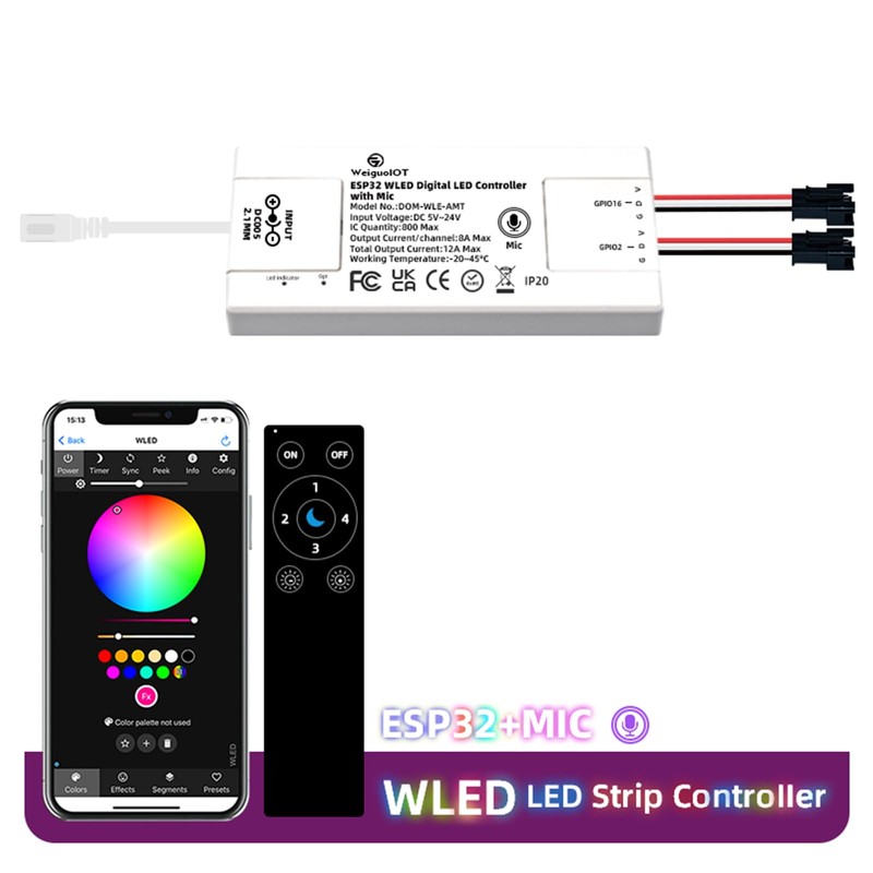 WeiguoIOT ESP32 WLED Digital LED Strip Controller with Microphone Ultra-Thin, RGB RGBW RGBCCT Addressable Strip Dual Output, 5-24V, 12A, Smart App Control, Music Sync, Work with Home Assistant, Alexa