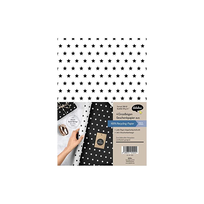 Weihnachtsgeschenkpapier-Set: Sterne (schwarz/ weiß): 4x Einzelbögen + 4x Geschenkanhänger