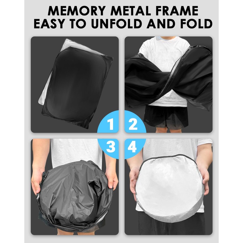 • Multi-layer structure protection: the front windscreen sun shade of the car is made of high-density aluminium foil and high-quality nylon material. The outer reflective aluminum foil reflects sunlight and UV rays and blocks most of the heat and radiation, while the inner black nylon layer absorbs surface heat to keep your car cool.