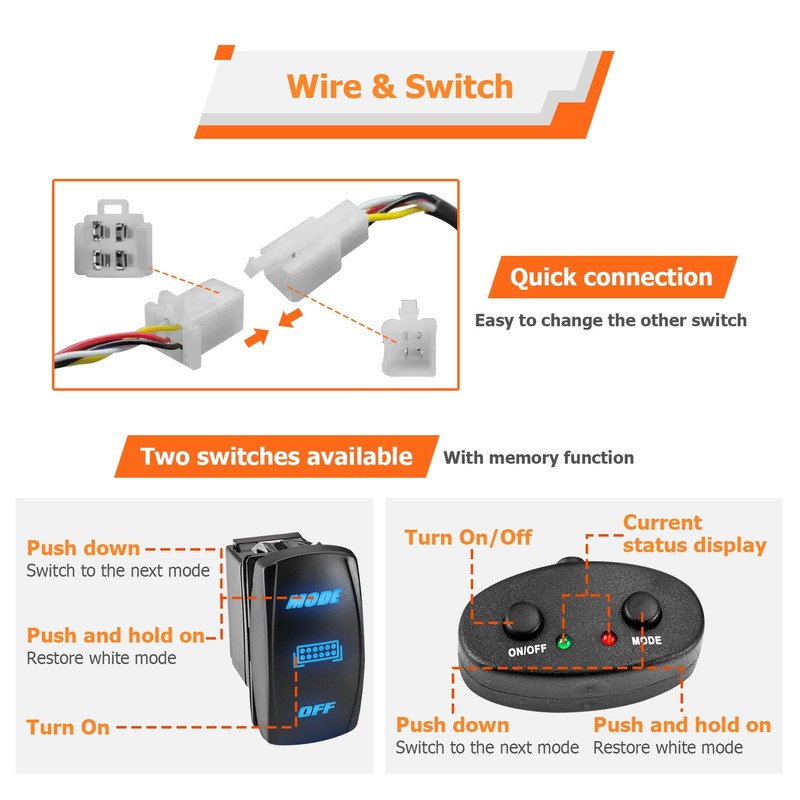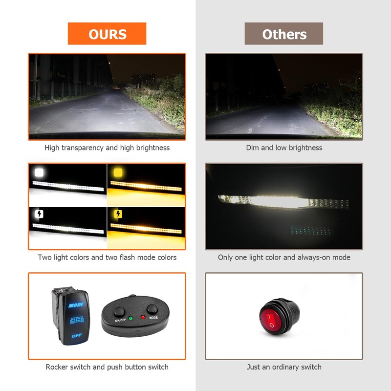 - 4 Light Modes & Memory Function: The light bar equipped with 100pcs high-power white&amber dual color LEDs, can provide light output, high brightness. and has 4 lighting modes and a memory function design. The memory function allows the light bar to be turned on again in the mode it was last turned off in