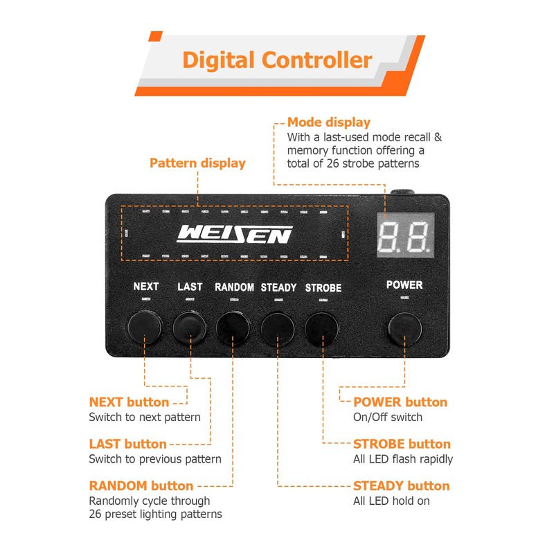 • Multi-pattern Lighting: Digital display controller with patterns display offers a total of 28 strobe patterns. A total of 28 lighting patterns includes 13 Sequential Dynamic modes and 13 flashing modes,meeting your Emergency lighting needs..